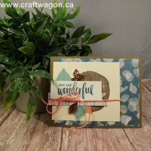 A little creative inspiration for you. I created this card for our event. If you look closely you will notice the similarities with the middle pink card in the catalog. This is called CASEing. (Copy And Share Everything… be sure to give credit to where you are inspired). I turned the card to a landscape design, and switched from Petal Pink to Soft Sea Foam and lastly, I used different Designer Series Paper and Silver &Pool Party Baker’s Twine. It goes together quickly.