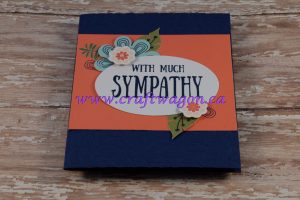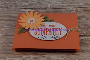 Cut a piece of scrap Calypso Coral 1-1/2″ x 4-1/4″ and flag both ends, attach to the center of the card